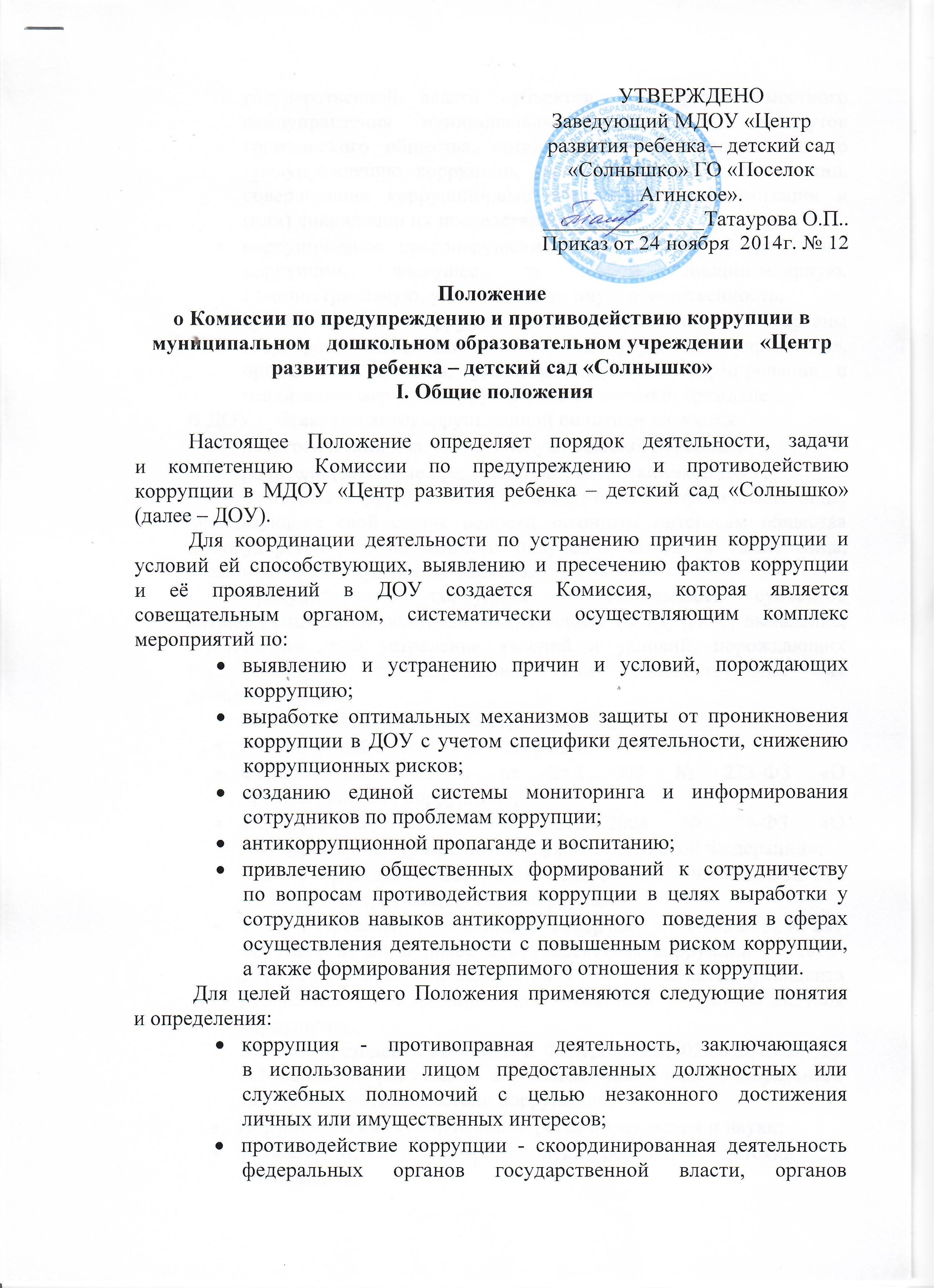 Положение о Комиссии по предупреждению и противодействию коррупции в муниципальном дошкольном образовательном учреждении «Центр развития ребенка – детский сад «Солнышко»